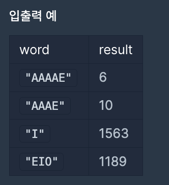 A, E, I, O, U의 문자만 사용할 수 있으며 길이가 최대 5글자 까지만 등장한다.